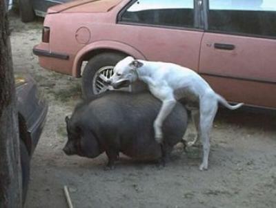 Picture of a dog anxiously mounting a huge hog from behind - should lead to some strange offspring.