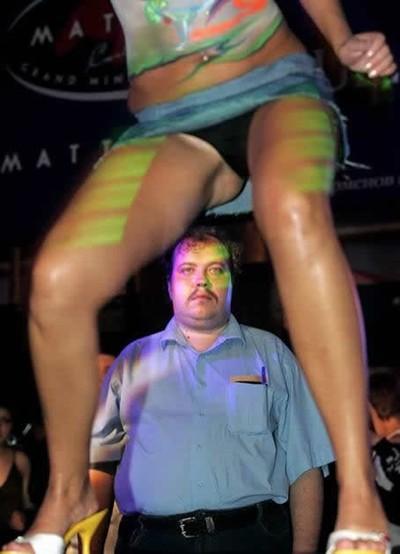 Picture of a girl dancing in a really short skirt and she appears to have hypnotized some creepy guy.