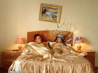 Picture of a couple lying in bed and based on the damage it's a good thing she was wearing protection.