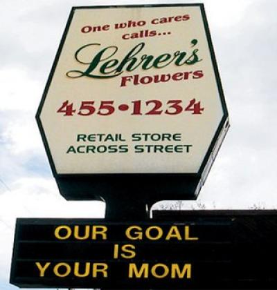 Picture of a flower sign and the marquee proudly displays that their goal is your mom.