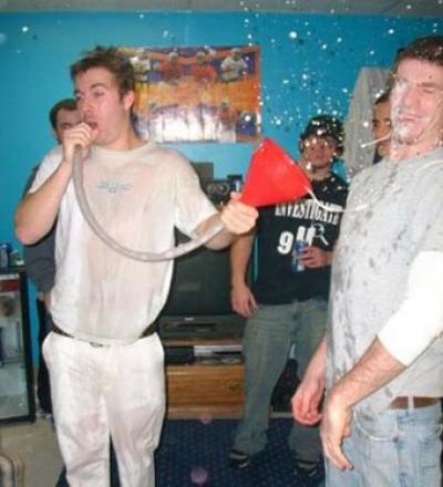Picture of a guy holding the top of his beer bong while projecting the booze right back out of it.