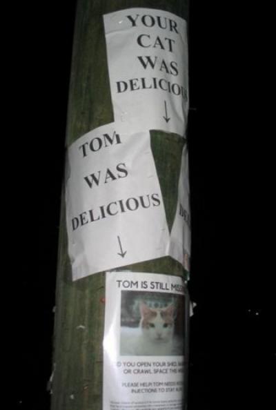 Picture of a missing cat sign posted up on a telephone pole, along with some response postings.