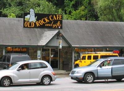 Picture of a restaurant called the Old Rock Cafe and the sign has a mascot that is somewhat phallic.