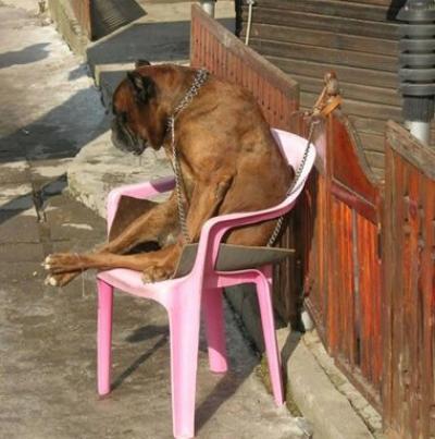 Picture of a big dog sitting in front of a house reclined like a person in a plastic chair.