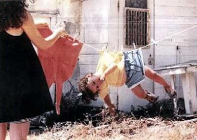 Picture of a mother who has her child hanging up on a clothesline just like a piece of laundry.