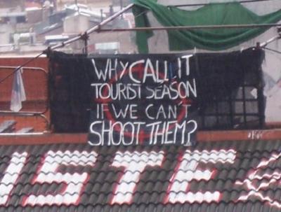 Picture of a sign that asks why call it tourist season if you're not allowed to shoot them.