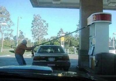 Picture of an old man who pulled up the wrong side of his car at the gas pump, but doesn't care.