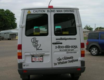 Picture of a van with a caution on the back informing us that a blind man is driving...