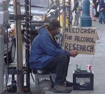 Picture of a homeless guy holding up a sign asking for cash for his dedicated alcohol research.