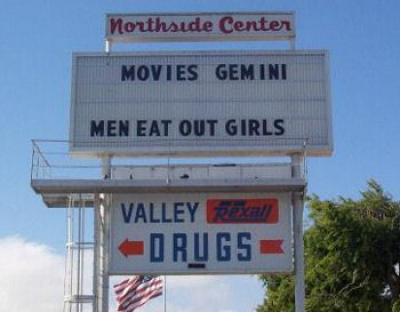 Picture of a marquee billboard for a movie theater where the letters have been re-arranged.