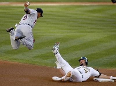 Picture of a second baseman attempting to turn a double play and the timing is quite hilarious.