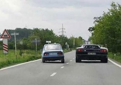 Picture of a little car pulling out to pass after sitting behind a slow driving sports car.