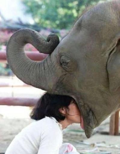Picture of a woman sticking her entire face into the open mouth of an elephant.
