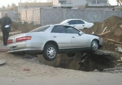 Picture of a car miraculously wedged above a giant sinkhole in the ground beneath it.