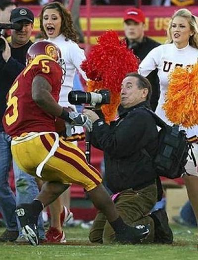 Picture of a photographer at a USC football game who is milliseconds away from being run over.