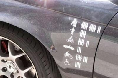 Picture of a side of a car with a tally scoreboard for all of the people he's hit.