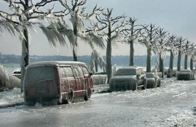 Picture of a snow-covered street that got so cold just about everything is completely iced over.
