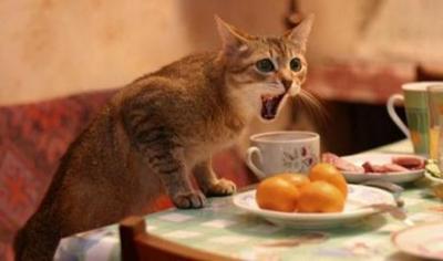 Picture of a cute little cat sitting at a dining table looking as mad as an angry restaurant patron.