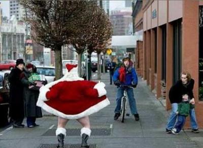 Picture of a man dressed as Santa Claus out on the sidewalk flashing a bunch of terrified people.