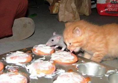 Picture of a mouse sitting right next to a cat while they both lick frosting off of some cupcakes.
