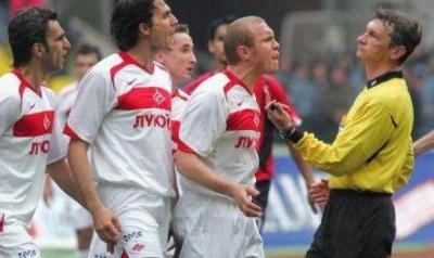 Picture of a bunch of angry soccer players crowding a referee who gives them all the finger.
