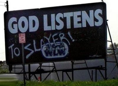 Picture of a billboard that says God Listens, and someone added the words to Slayer beneath it.