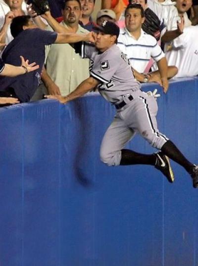 Picture of a baseball player going into the stands for a ball and getting a fist in the face.