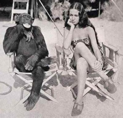 Picture of a cute chimpanzee sitting on a chair copying the pose of the model sitting next to him.