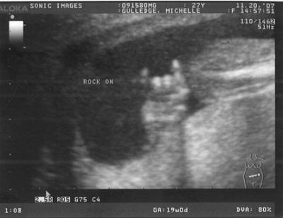 Picture from an ultrasound scan with an in-utero baby who is seriously ready to rock and roll.