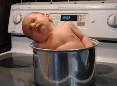 Picture of a little baby sitting in a large cooking pot placed on top of a stove burner.