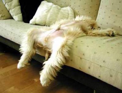 Picture of a dog sleeping on the couch on his back and completely spreading his limbs out.