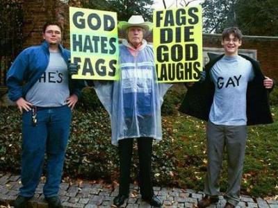 Picture of a hateful, homophobic man holding up signs and two kids make him look foolish.
