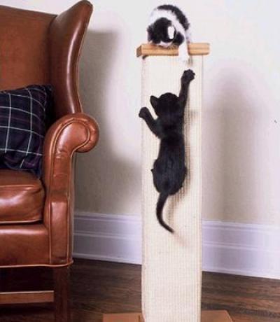 Picture of two cats staging a dramatic rescue, as one of them is hanging from the scratching post.