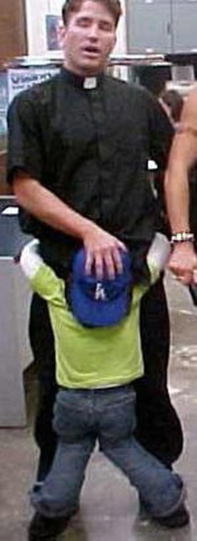 Picture of a guy wearing a halloween costume as a dirty priest taking advantage of an altar boy.