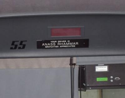 Picture of a placard with a public bus driver's name and the poor guy must get teased quite a bit.