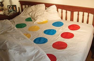 Picture of a bed with some very kinky sheets that have the same pattern as a twister game mat.