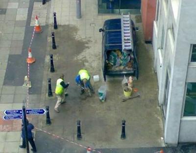 Picture of some workers installing concrete posts and they've trapped their vehicle inside them.