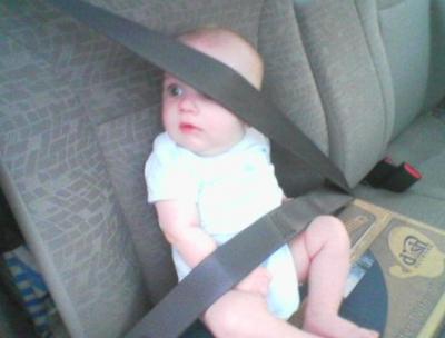 Picture of a baby sitting in a car without a car seat, placed on top of a box and using the belt.