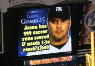 Picture of the big screen at Yankee stadium featuring an obvious countdown for a career mark.