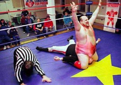 Picture of a wrestler who has his opponent pinned by literally sitting down on top of his face.