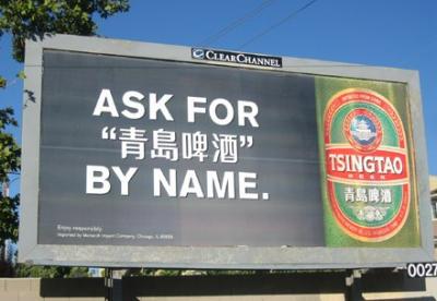 Picture of a billboard for Tsingtao Beer making an odd request of its American customers.