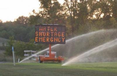 Picture of a sign announcing a water shortage emergency while two sprinklers spray tons of water.