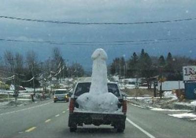 Picture of a pickup truck with a snow sculpture in the bed shaped like an enormous penis.