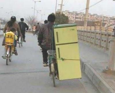 Picture of a guy riding his bike with a refridgerator strapped to one side of it.