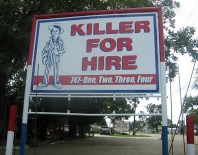 Picture of a very strange billboard advertising some sort of service called Killer for Hire.