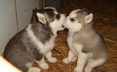 Picture of two cute little puppies, one of them softly biting the mouth and nose of the other.