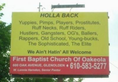 Picture of a billboard for the First Baptist Church of Oakeola, and they're very open-minded.