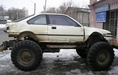 Picture of an old beat-up car that has been modified so it sits on top of some huge tires.