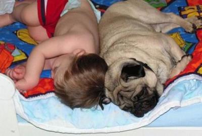 Picture of a baby boy lying back to back with the family dog and in almost the exact same position.
