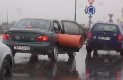 Picture of a car transporting a large plastic pipe that is sticking out of the car's side doors.